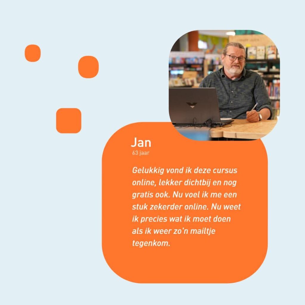 Man zit thuis achter zijn laptop en wordt bestookt wordt met spam/phishing mail, twijfelt of hij moet klikken. Via Google komt hij uit op de website van DANN. Daarna zie je hem in een cursuslokaal met andere cursisten. Vervolgens weer thuis ziet je dat hij precies weet wat hij met de spammailtjes moet doen.